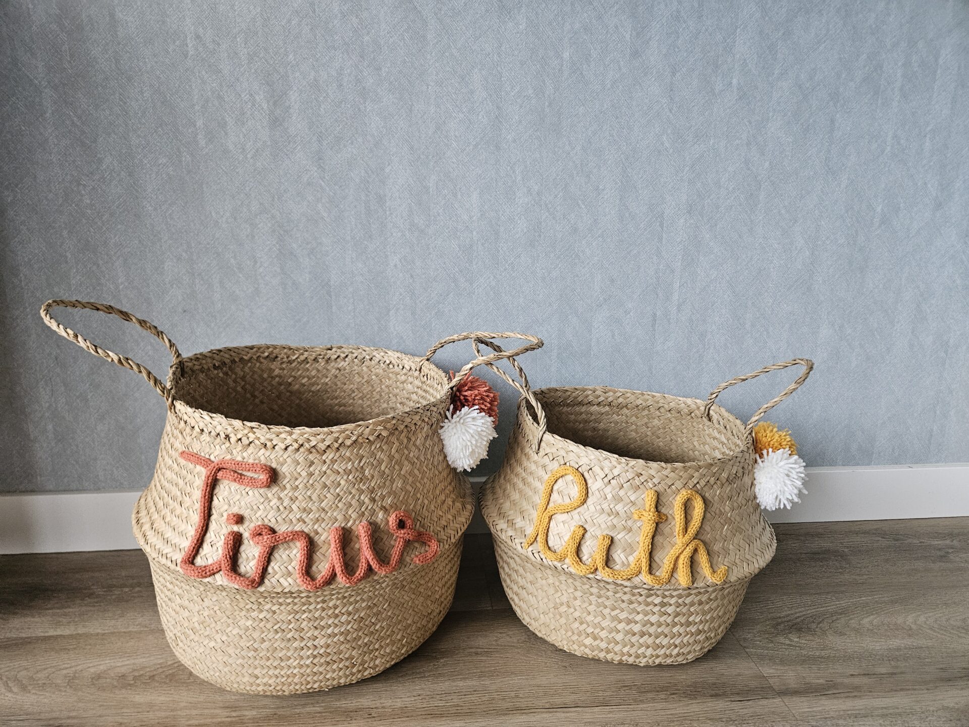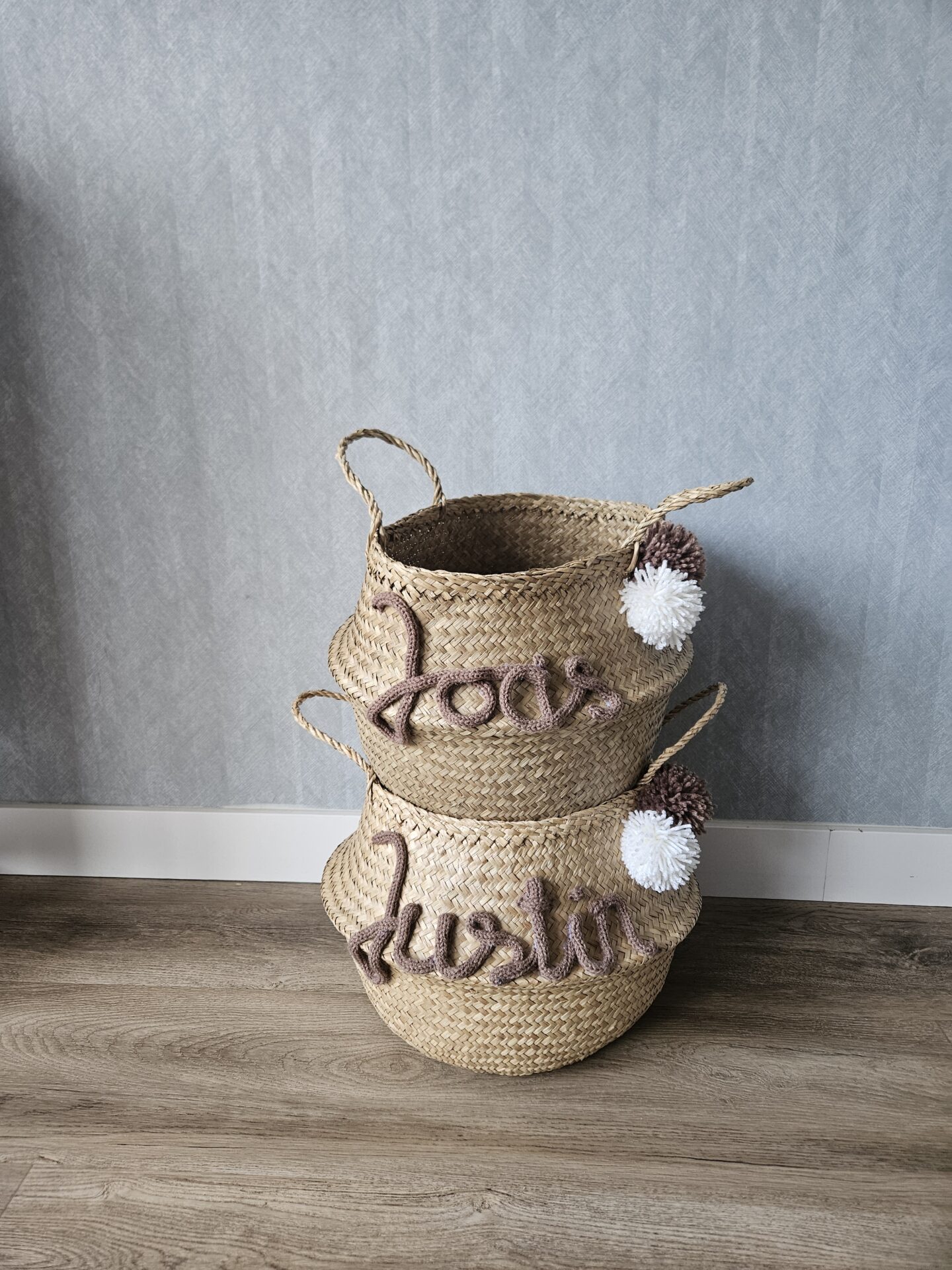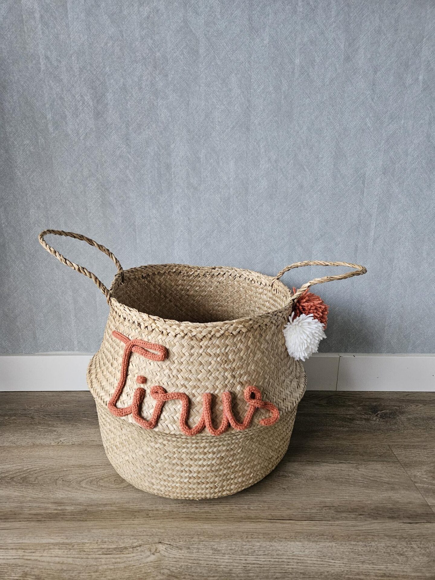 Deze mand is van zeegras gemaakt en heeft lekker veel opbergruimte voor het speelgoed en-/ of knuffels. Kies de gewenste kleur van de naam en deze word erop gepunnikt. Hoe leuk een gepersonaliseerd mand voor op de kinderkamer of als kraam cadeau!