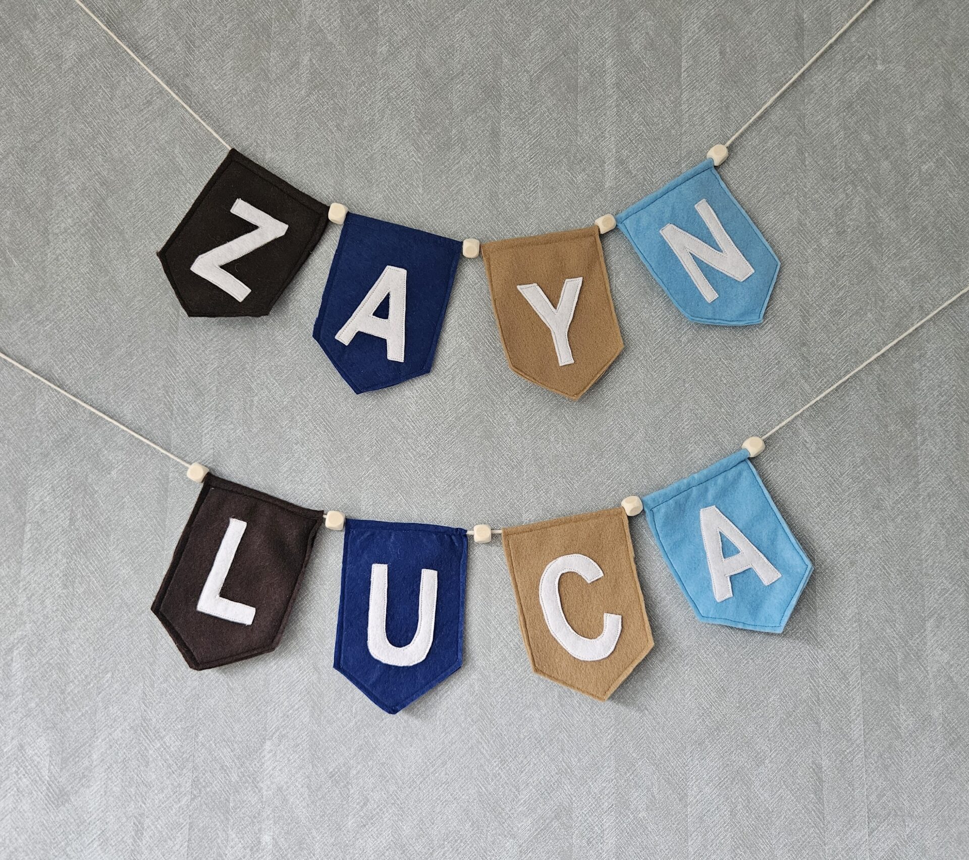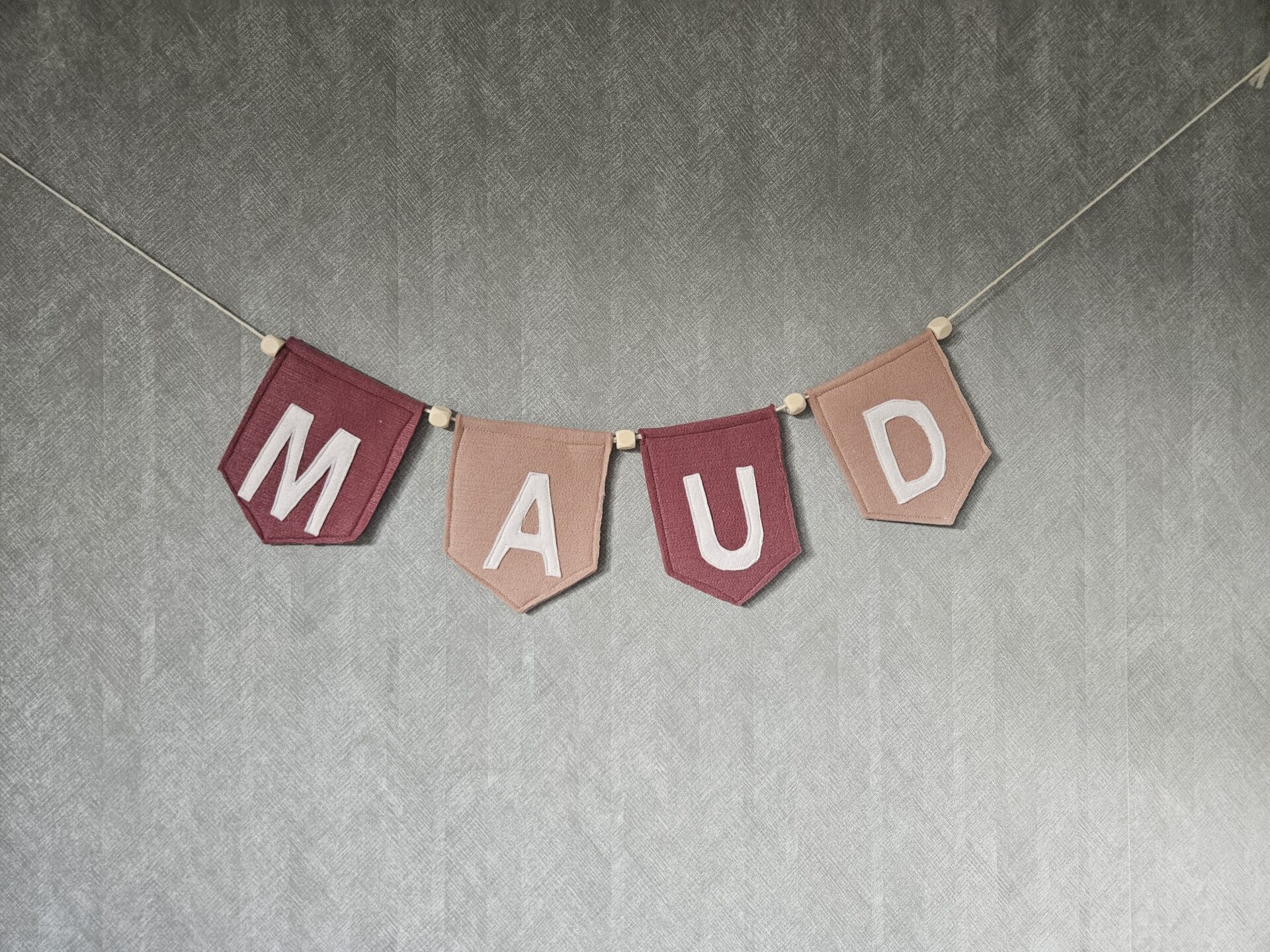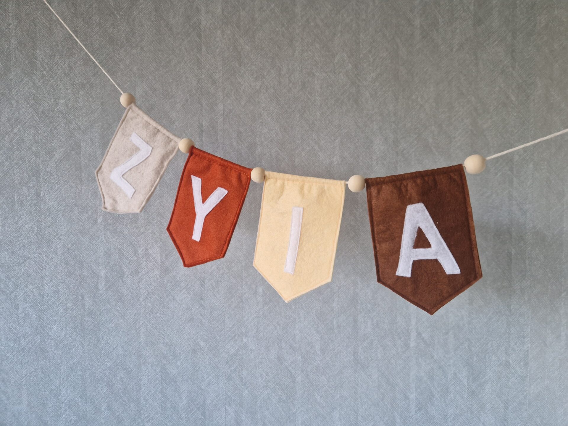De letters zijn wit. Tussen de vlaggetjes zitten houten kralen.