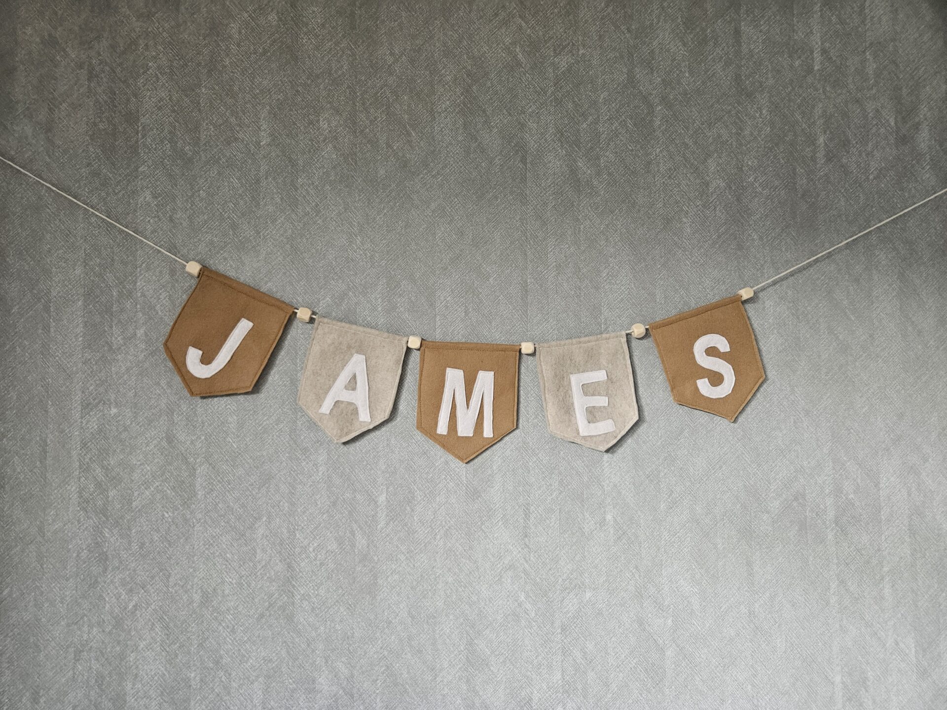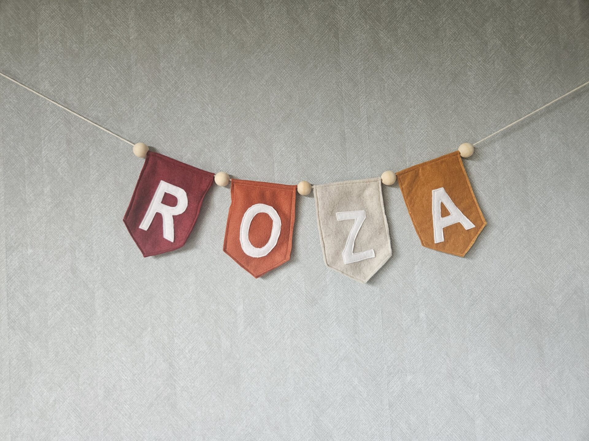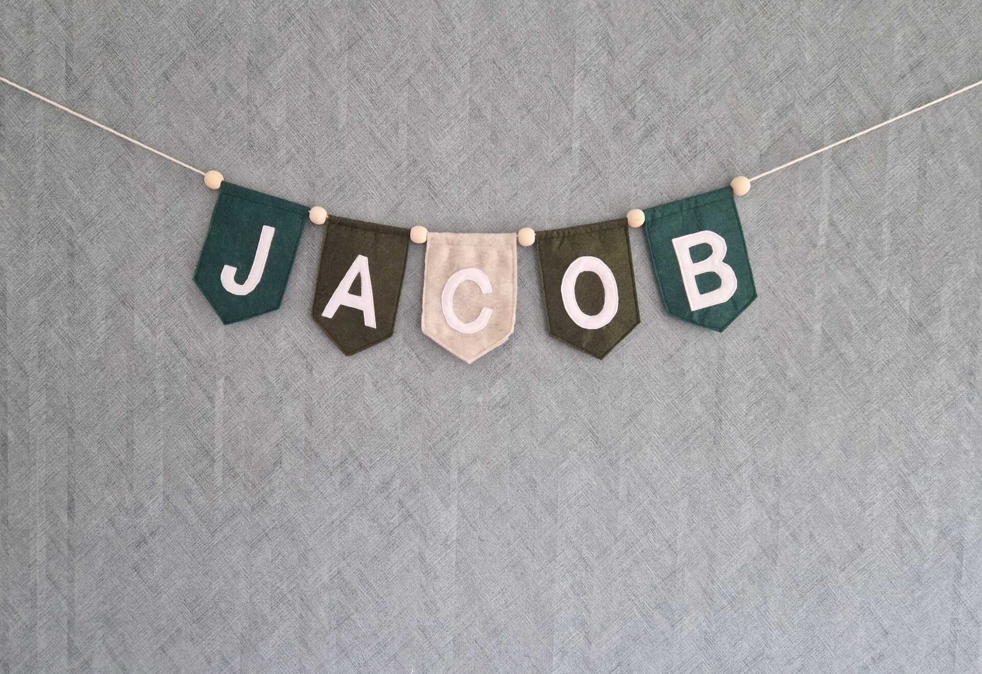 De letters zijn wit. Tussen de vlaggetjes zitten houten kralen.